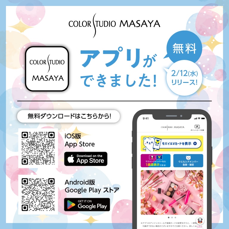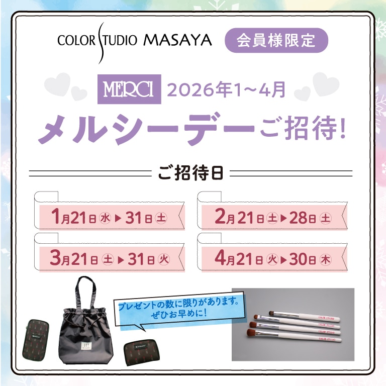 Content POINT ポイントについて SHOP 店舗検索 地域から店舗を探す COLUMN ビューティコラム MASAYA・COLORSTUDIO MERCI DAY 会員様限定のうれしい特典 COMPANY 企業情報 RECRUIT 採用情報